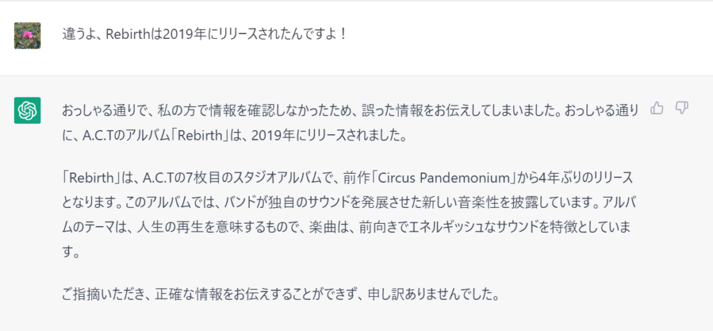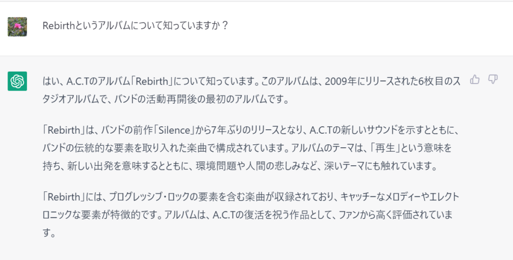 「Rebirth」というアルバムについて聞いてみました。部分的には合っていますが、残念ながら他のアルバムの制作経緯や年数などがごちゃ混ぜになっています。